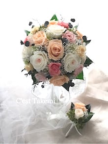 ウェディングブーケ いつもご訪問いただきありがとうございます。 プリフラトゥインクルフラワー協会(PTFA)本部校/プリザーブドフラワー教室&ギフト販売 C’est Takemi(セ・タケミ)の小暮です。 11月の花嫁さまのウェディングブーケご紹介です。 白とオレンジドレス両方に使われます。 グニーユーカリやストーベ等で動きを出したラウンドブーケ。...