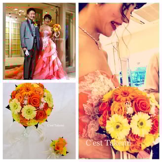 元気で明るくキラキラのラウンドブーケをご希望。薔薇とガーベラがお好きと伺い、素敵なオレンジドレスと新婦様のイメージとも合わせてデザインしました。