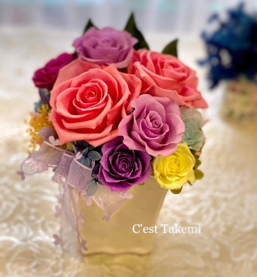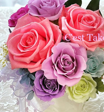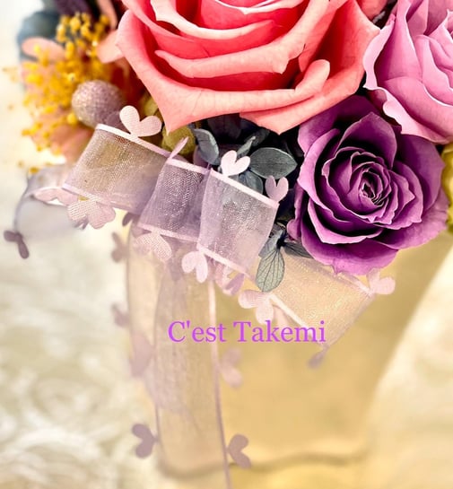 ご希望を伺い、幸せカラーのピンクを中心にパープルグラデーションの薔薇で仕上げました。
