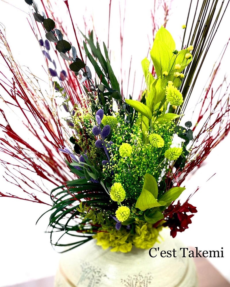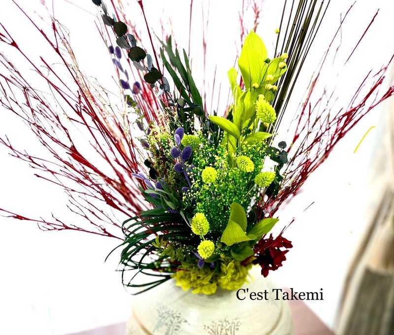 「お花は使わずグリーンで生き生き伸びやかに、明日も頑張ろうと思えるような作品」がご希望です。