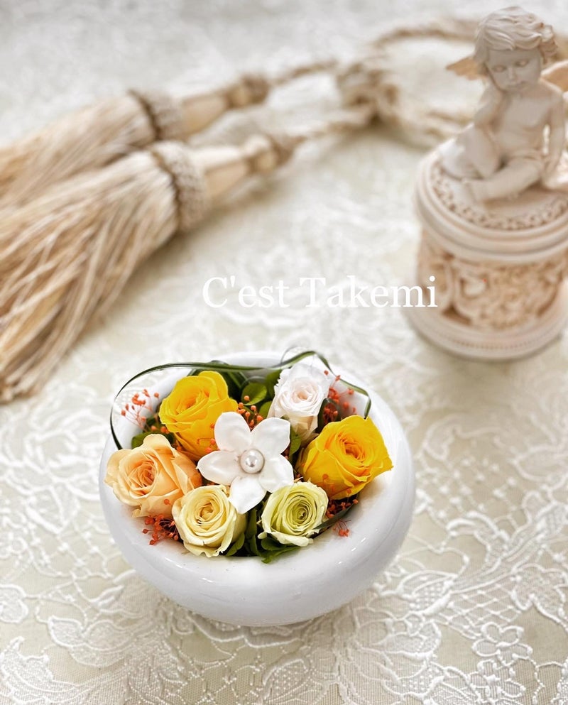 ぷっくりかわいい花器にジャスミンと薔薇をギュッと詰め込み、リーフリボンで動きをプラスした可憐なアレンジです。