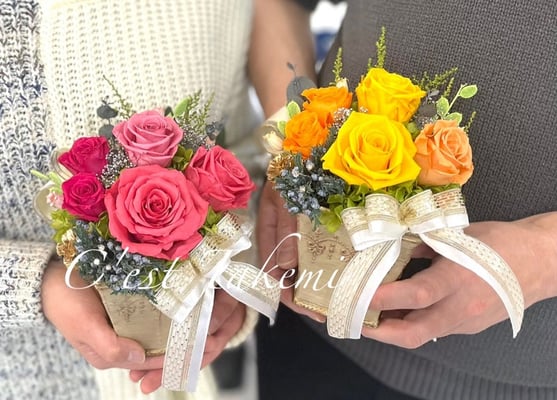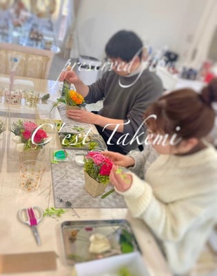 C'est Takemiのデザインサンプルをご参考に、新郎新婦様お二人でそれぞれご両親への贈呈花をプリザーブドフラワーで制作されました。